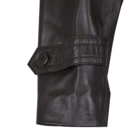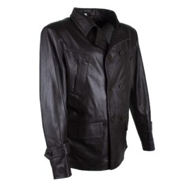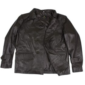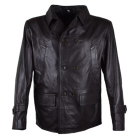A sophisticated double-breasted coat crafted from rich, dark brown genuine leather. This tailored piece features a broad collar, large button closures, two flap pockets, and stylish yoke detailing across the chest. It offers a refined and modern alternative to the traditional fabric peacoat, perfect for smart-casual wear.